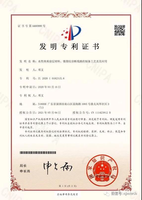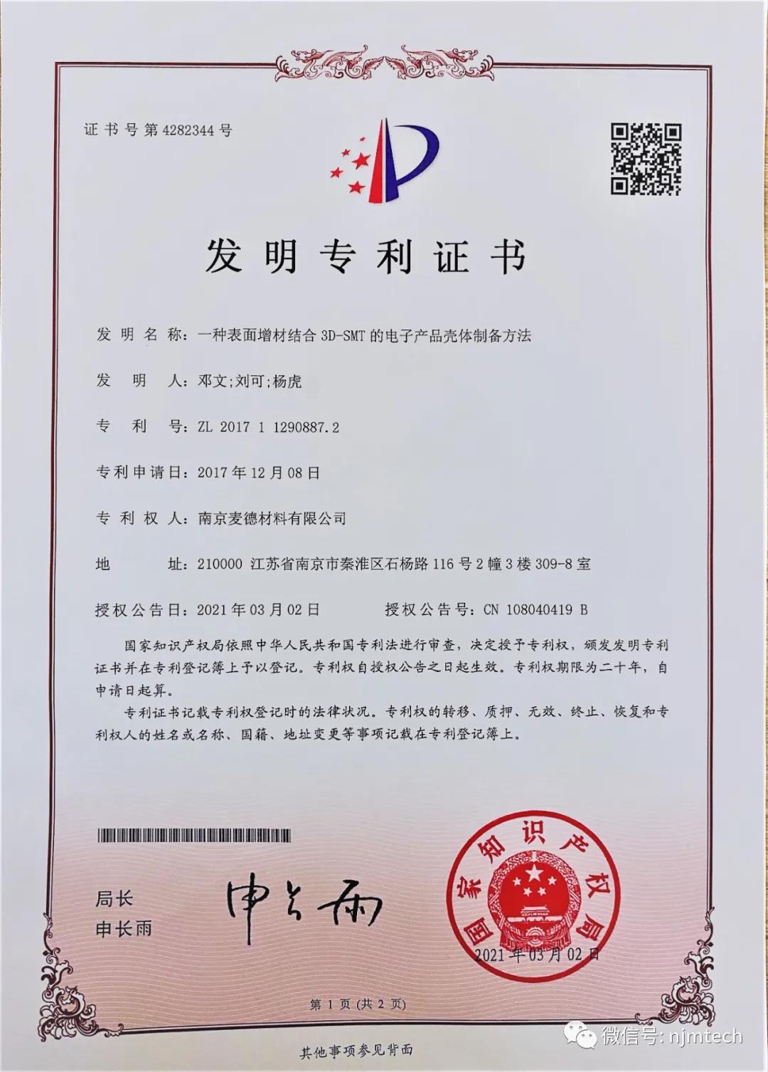 經(jīng)過核心研發(fā)人員連續(xù)16年的持續(xù)開發(fā)和堅持不懈的努力,并曾經(jīng)主導國家科技部財政部“科技新中小企業(yè)創(chuàng)新基金:14C26214422767,國科發(fā)計[2014]166號 《精細三維立體線路的關(guān)鍵技術(shù)研究開發(fā)》,從納米材料添加劑開發(fā),線路金屬化體系開發(fā),設(shè)備和工藝技術(shù)整體聯(lián)動開發(fā),目前可以在塑膠材料,陶瓷,金屬等多種材料表面實現(xiàn)三維立體線路。2020-2021年累計授權(quán)知識產(chǎn)權(quán)13項,其中國內(nèi)國際領(lǐng)先的3D-MID核心發(fā)明專利2項。